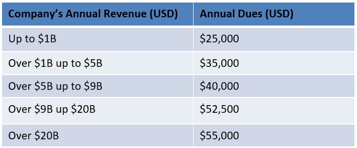 For 2025, RBA members will pay annual membership dues of $25,000 - $55,000 USD, depending on their company's revenue, as outlined below. New members also pay a one-time application fee of $5,000.